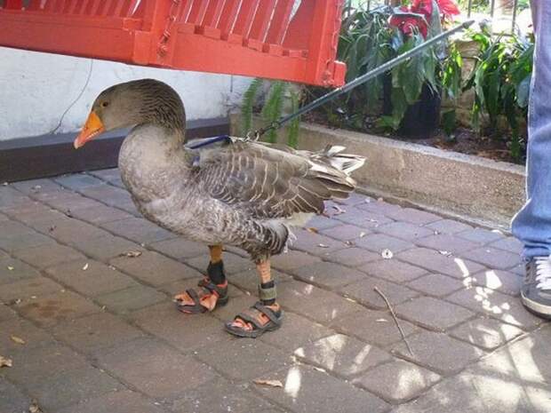 Знакомьтесь, домашний гусь по имени Gator. Живет этот модник во Флориде. Хозяева, очень часто гуляют со своим питомцем по городу, а там ведь сплошной бетон. Вот и решили заботливые владельцы одевать на гуся сандалии.