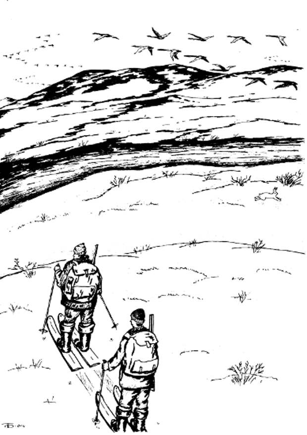 Окопы в снегу наш друг выкопал хорошие. Бруствер замаскировал ветками. Для сидения мы пристроили лыжи и начали караулить. Вскоре с южной стороны над лайдой появилась пунктирная линия, которая перемещалась в сторону нашей засидки.