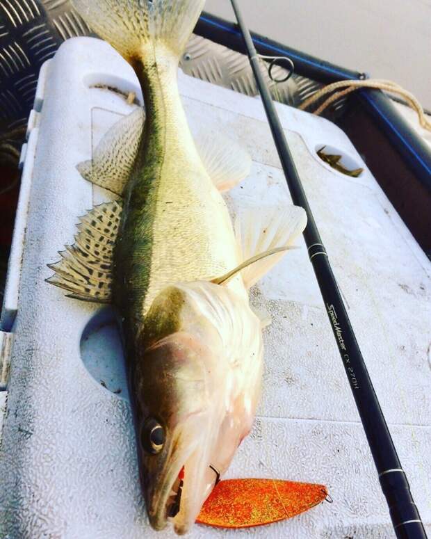 Так в лодке очутился первый, за сегодня, судак на отвесную блесну.