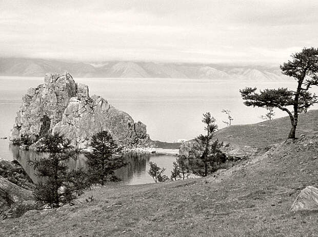 В стороне от Байкала черными холмами виднеются избы села. А рядом выгнула спину тайга, ощетинилась. В бледной, как бы истомленной голубизне неба вьется несколько тонких спиралей дыма. Тихо на Байкале. Тишина, кажется, густеет и давит на воду...
