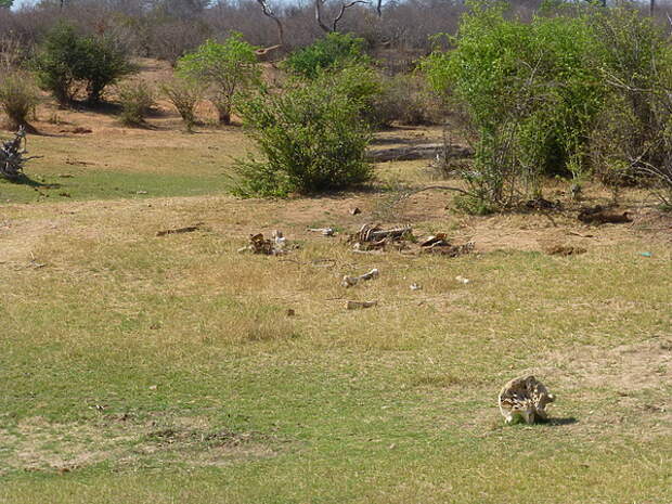 На земле аккуратно лежали череп с бивнями, свернутые в рулон четверти шкуры, четыре ошкуренные ноги, два уха и хвост. Мясо, нарезанное порциями, было свалено в две кучи на подстилку из веток, а хобот отложен в сторону: по местной традиции, он — собственность вождя данной территории. Кости сложили отдельно, и на месте падения слона осталось только мокрое место и содержимое желудка, а сам желудок и кишечник были вычищены и тоже поделены для раздачи местным.