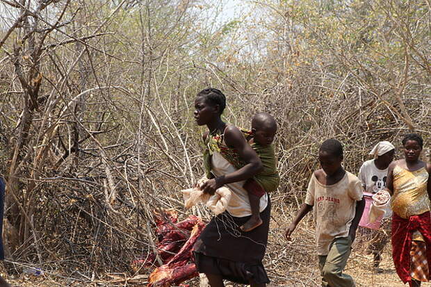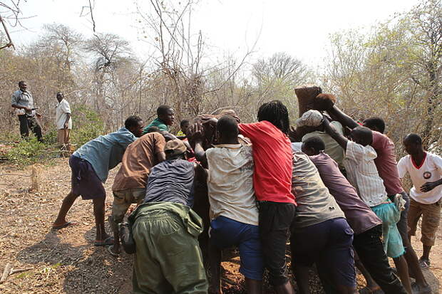 Было решено позвать за мясом жителей близлежащей рыбацкой деревни, расположенной в нескольких километрах от места охоты, а также людей из окрестных деревень. Молодежь поможет разобрать слона, а пара старейшин займется дележом мяса на равные части для последующей раздачи.Организация разделки и последующей раздачи мяса — дело непростое и даже творческое. Нужно не только правильно отделить трофейные части, разобрать тушу, но и организовать поочередный подход за мясом местных жителей (а их более ста человек) и контроль над тем, кто и сколько взял (человек везде одинаков: если есть возможность взять больше, чем сосед, — значит, это нужно сделать).