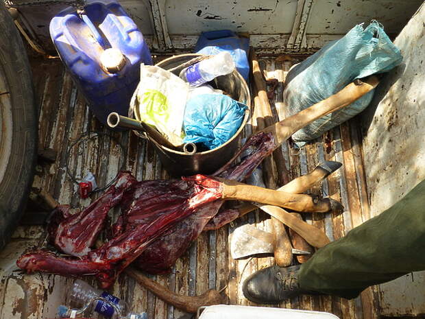 После традиционных поздравлений и трофейных фото стало понятно, что проблем такого масштаба у нашей команды еще не было: нужно что-то делать с тушей, причем как можно скорее, поскольку при температуре воздуха более +45 °С мясо портится очень быстро.