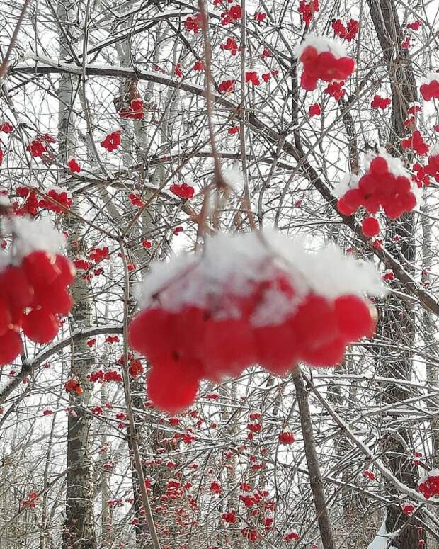 И стоит дотронуться протянутой «руки», как снег срывается с нее и «рука» тот час же вздымается ввысь, приветствуя меня.А калина. Смотришь на неё, алую, ледяную, но такую красивую, что сил удержаться нет. и ты срываешь эту стеклянную гроздь и отправляешь прямиком в рот.