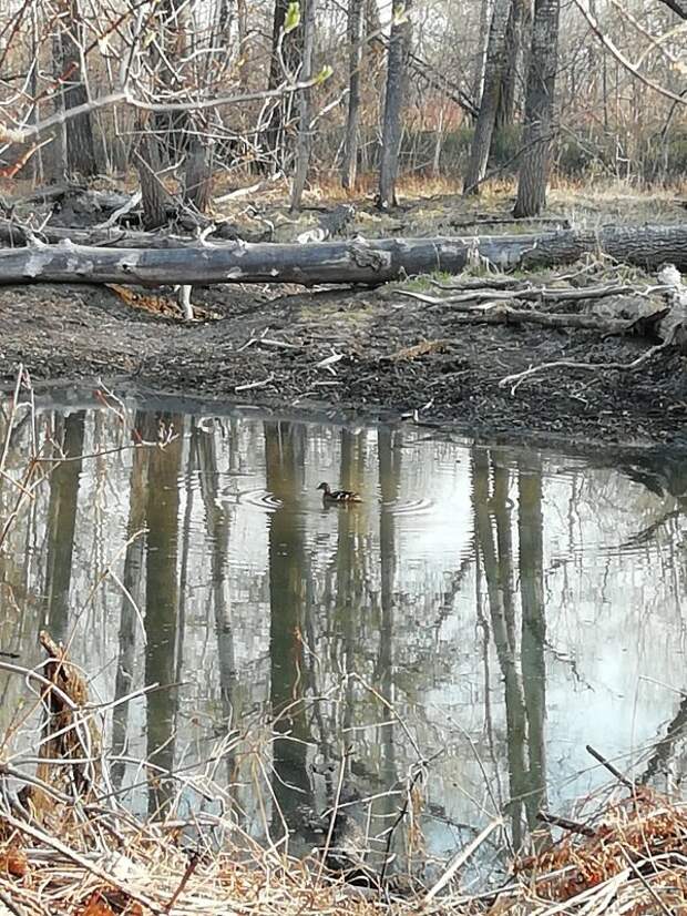 Сзади, на крутом берегу притаились мои собаки- Амур и Дымка. Они, как и утка, спят в пол глаза, временами стригут ушами. Я и сам разомлел- солнышко сквозь стволы деревьев нежно касается моего лица, заглядывает ко мне в глаза, слепит, балуется. Весеннее солнышко игривое, но не до этого мне- я жду утву.