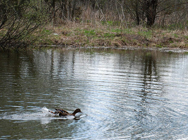 Резкая осадка и селезень мгновенно пошел на воду. Увидев это, к нему бросилась его утка, постоянно крича, как бы матеря соперницу. Но селезень сел, а она, развернувшись, снова подлетела к нему, продолжая орать на «неверного». «Мама», тихо покрякивая и склонив голову набок, как бы хитро смотрела на них.